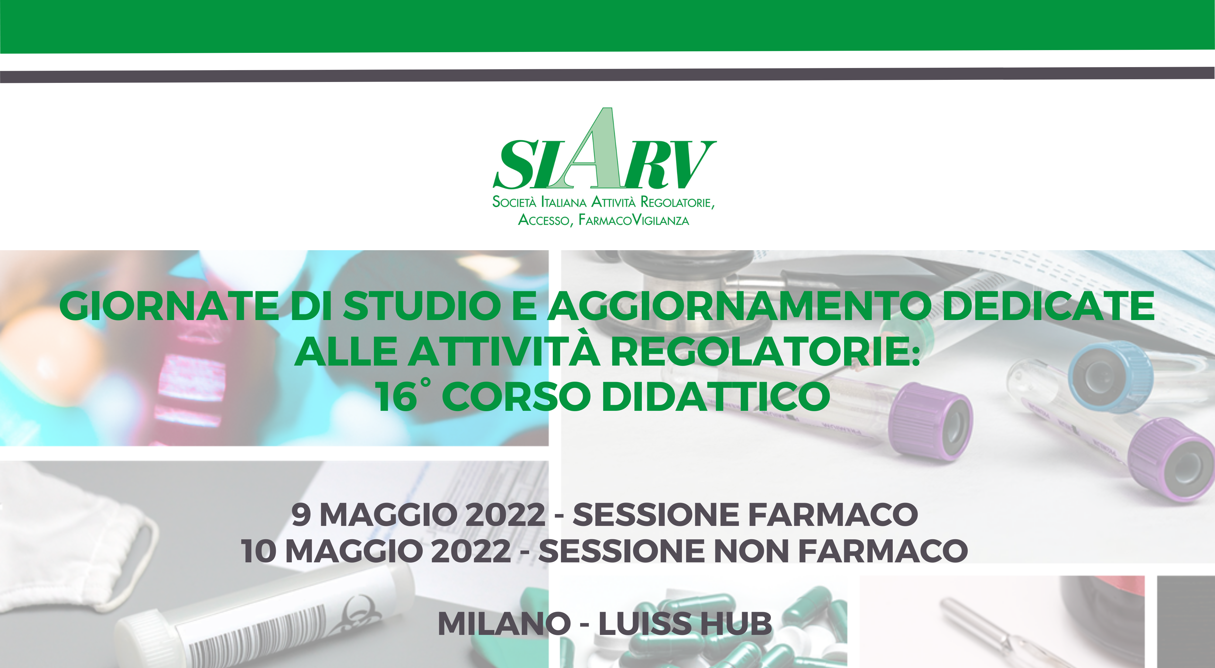SIARV è lieta di informarti che il 16° Corso Didattico “GIORNATE DI STUDIO E AGGIORNAMENTO DEDICATE ALLE ATTIVITÀ REGOLATORIE” è stato riprogrammato nel mese di Maggio: