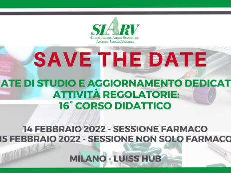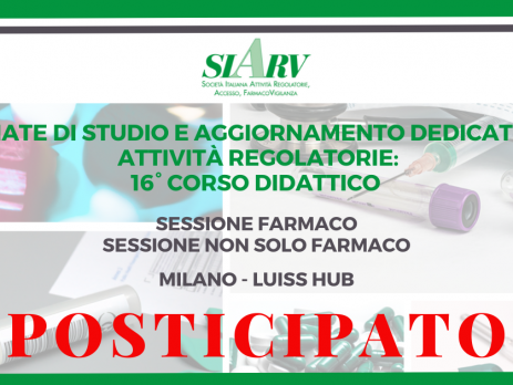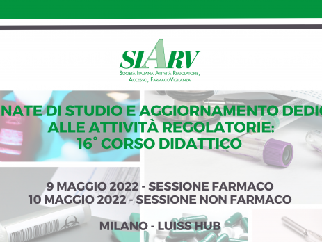 Cara/o Socia/o, SIARV è lieta di informarti che il 16° Corso Didattico "GIORNATE DI STUDIO E AGGIORNAMENTO DEDICATE ALLE ATTIVITÀ REGOLATORIE" è stato riprogrammato nel mese di Maggio:   Sessione Farmaco - 9 Maggio 2022 Sessione Non Farmaco - 10 Maggio 2022   L'evento si svolgerà presso il Luiss Hub di Milano in modalità ibrida.   A [...]